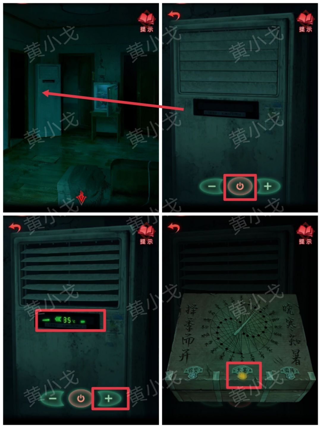 31.点击空调,打开;根据【二十四节气盒子】盒子上的线索,把温度调到最高;然后拿出【二十四节气盒子】,大暑按钮亮起