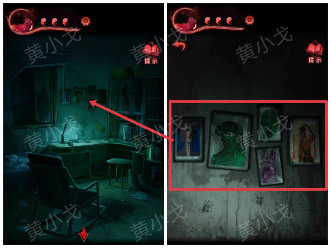 15.点击梳妆台抽屉上的密码锁,根据【纸条】上的线索,结合书房墙上的画,调整密码锁