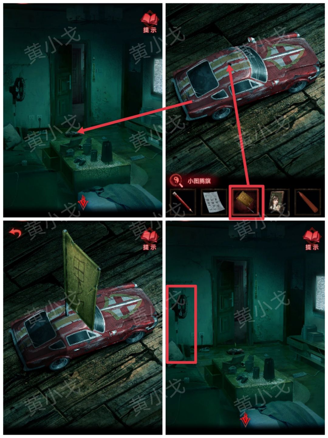 21.点击地上的模型车,把【小图腾旗】插入小洞中;点击风扇,吹动模型车,推倒厨房里的扫把