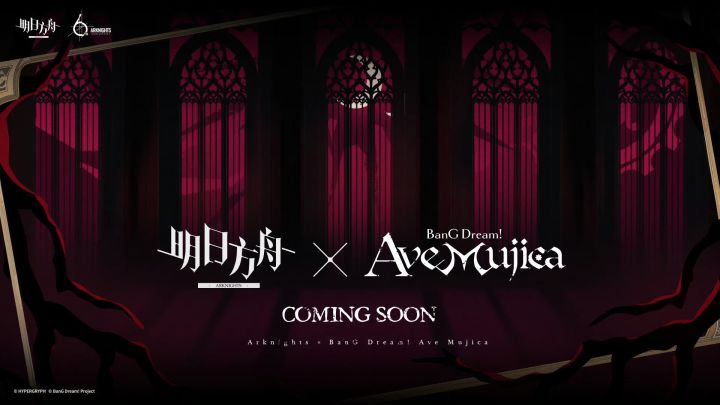在4月26日的《明日方舟》六周年特别直播节目中,官方宣布将与人气动画乐队《BIG BanG Dream!颂乐人偶》(Ave Mujica)进行联动。