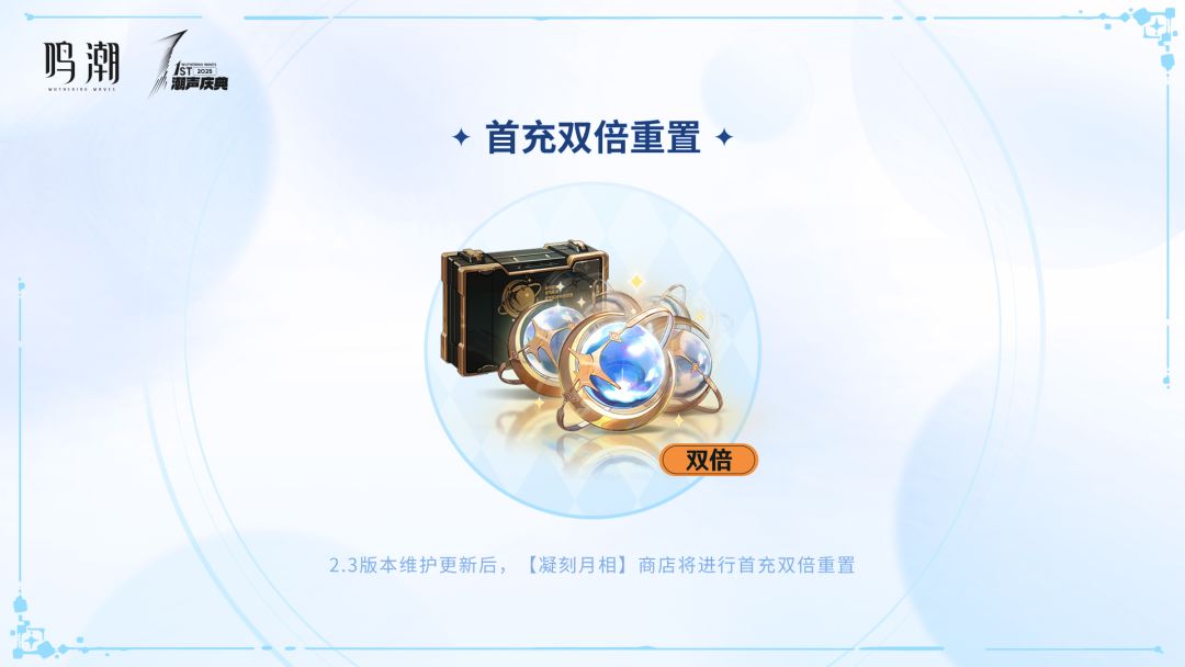 《鸣潮》游戏内【商城】-【凝刻月相】商店将进行首充双倍重置,届时漂泊者可以重新享受商店所有充值档位的首充双倍。