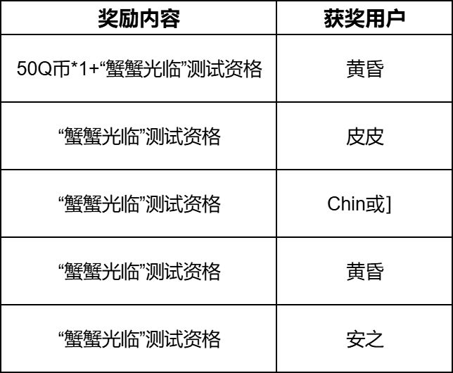恭喜以下星宝获得本次活动的Q币奖励和“蟹蟹光临”测试资格奖励哦~