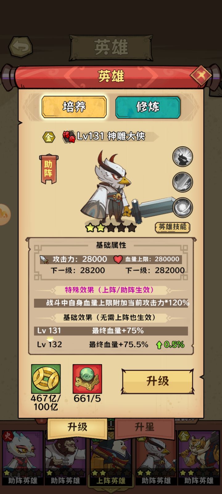 想玩攻击的需要把神雕星级升高,但不要升级修炼!