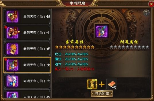 仙级生肖可在这里开通附魔增加特色附加属性,消耗一个本体+100万灵符即可附魔