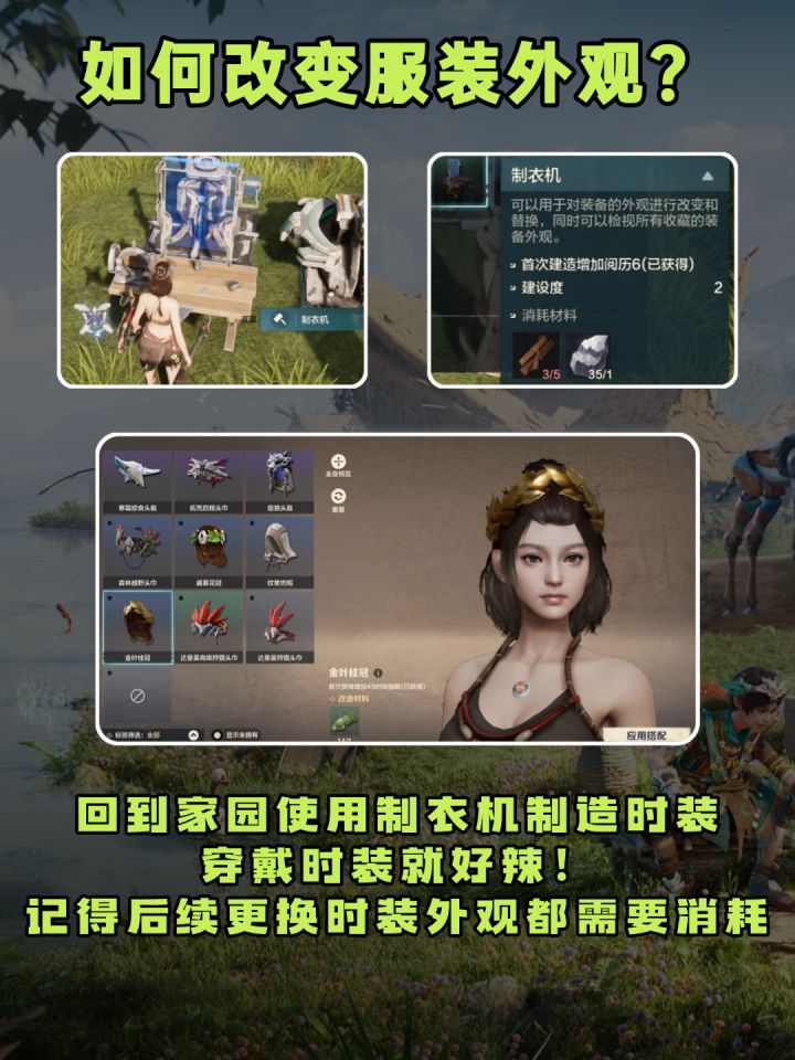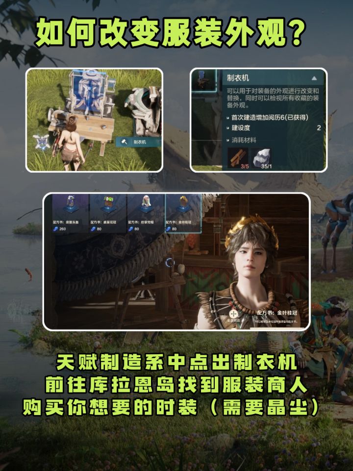 天赋制造系中点出制衣机,前往库拉恩岛找到服装商人购买你想要的时装(需要晶尘)回到家园使用制衣机制造时装,穿戴时装就好辣!记得后续更换时装外观都需要消耗。