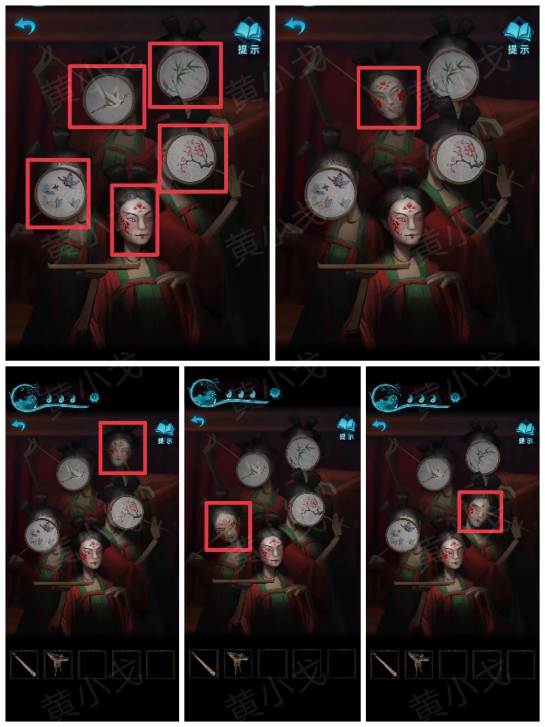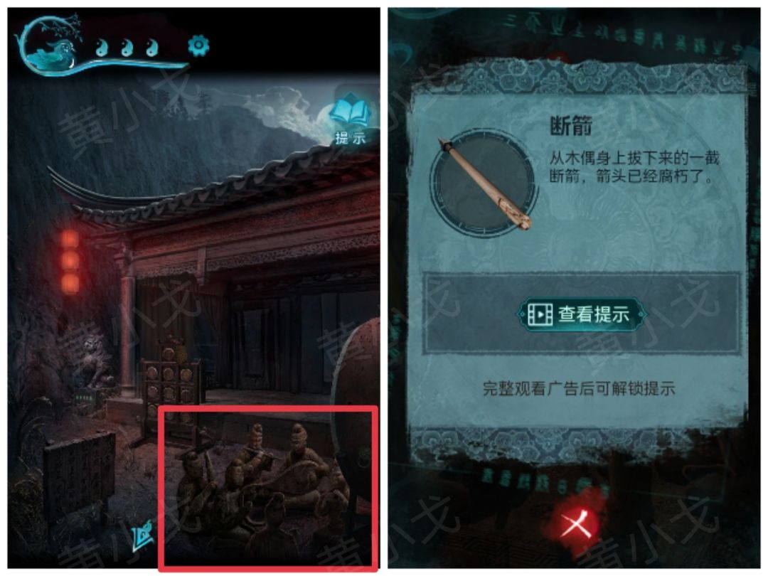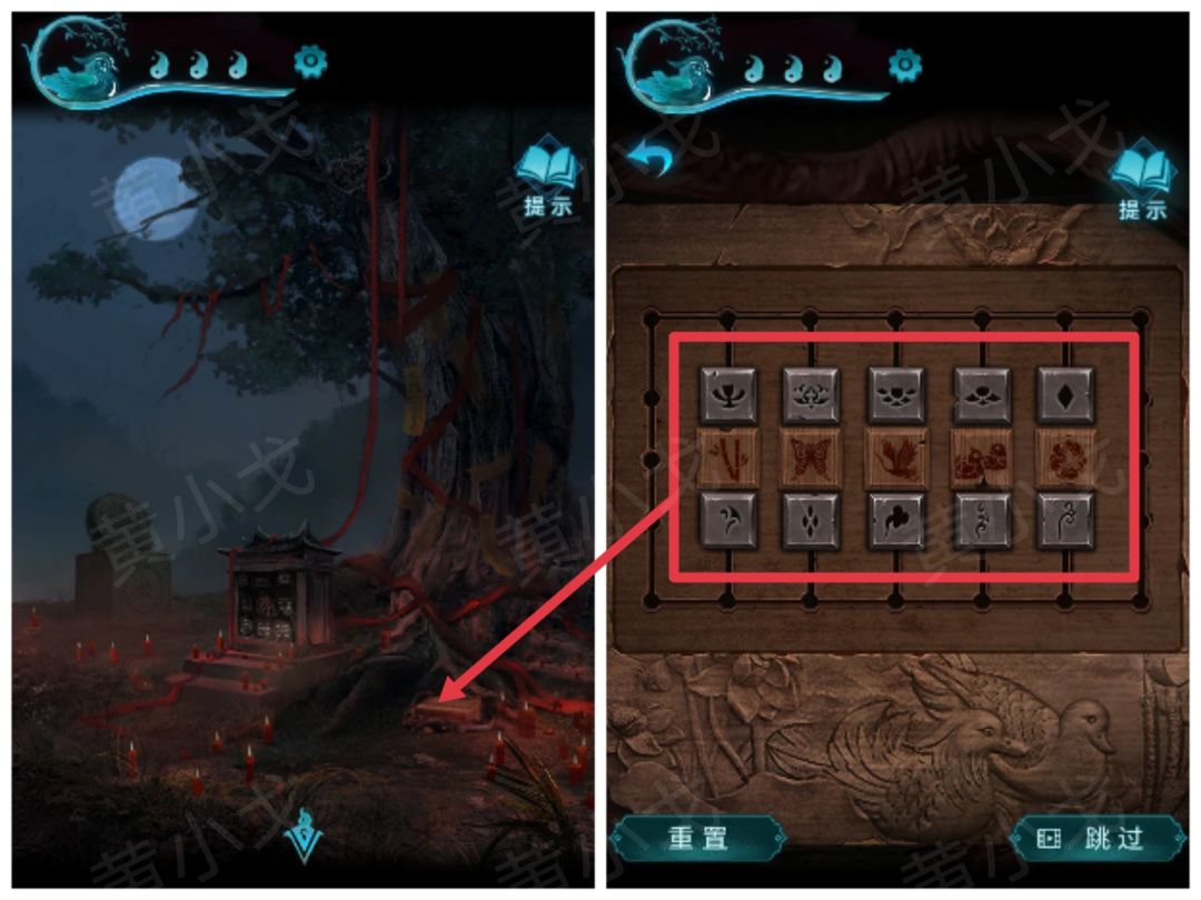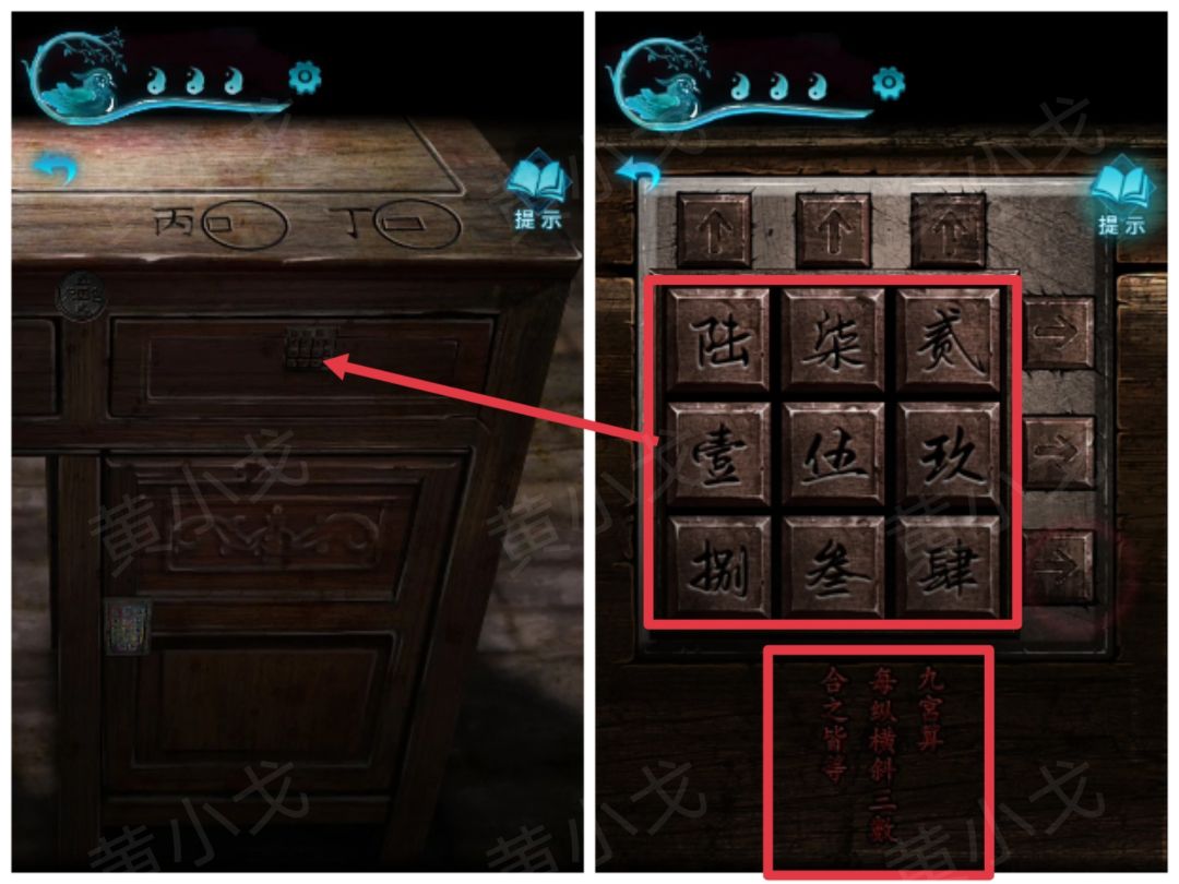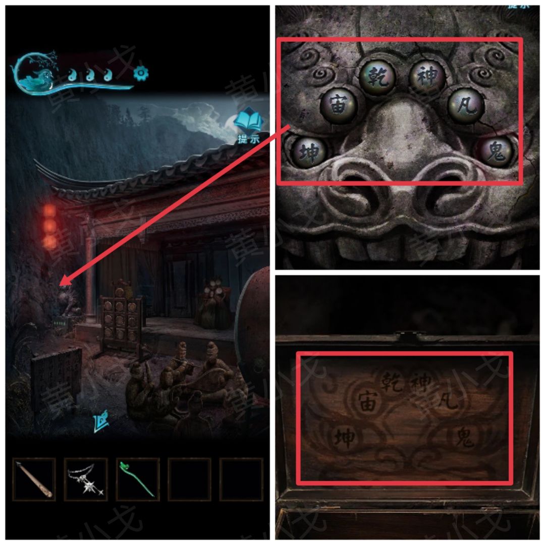17.点击戏台旁边的石像,根据盒盖上的线索,调整机关,暗门机关启动,打开暗门,进入密室
