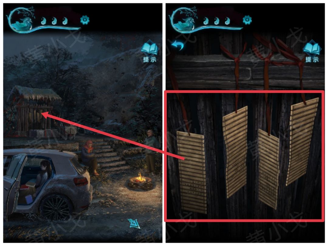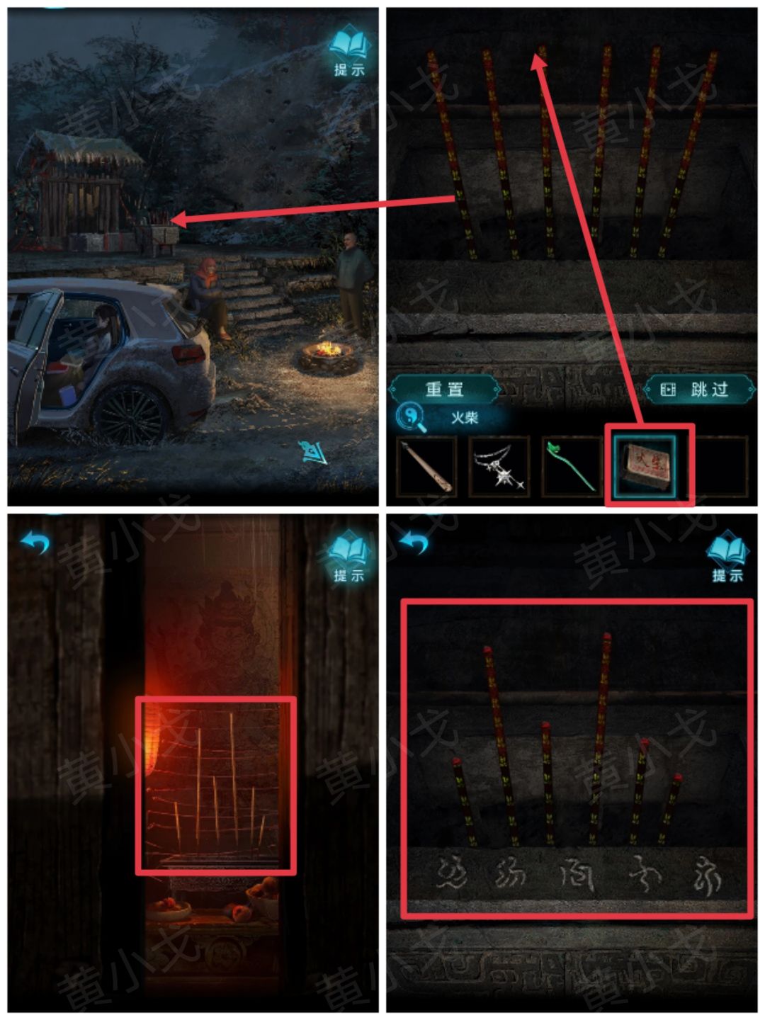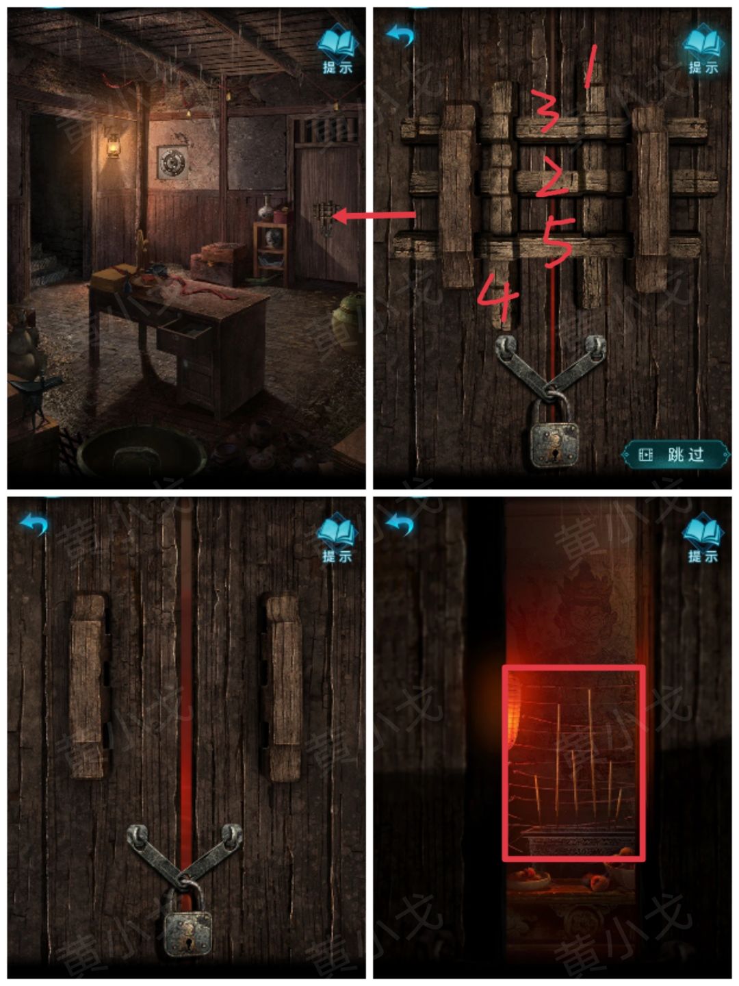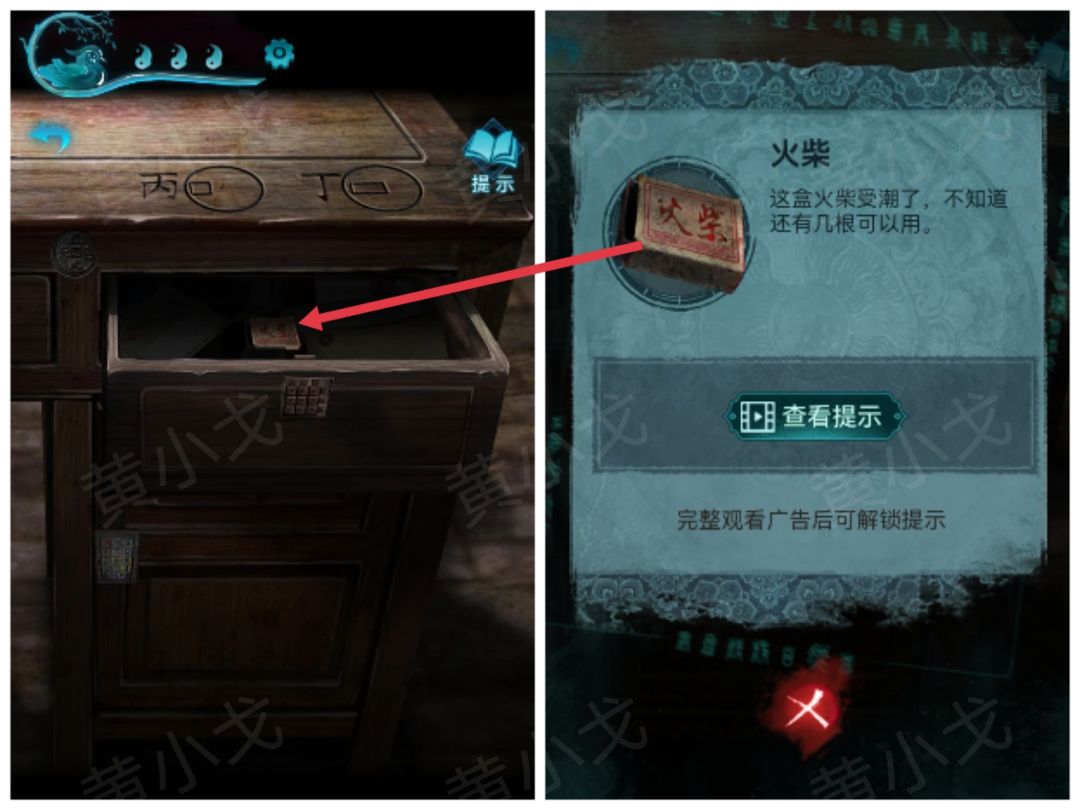 22.点击香炉,根据通过门缝看到的线索,用【火柴】将香点燃为特定的高度对比,获得符号线索