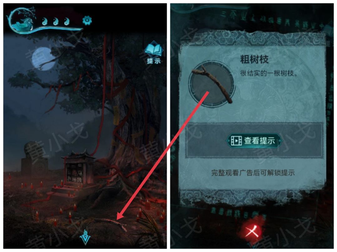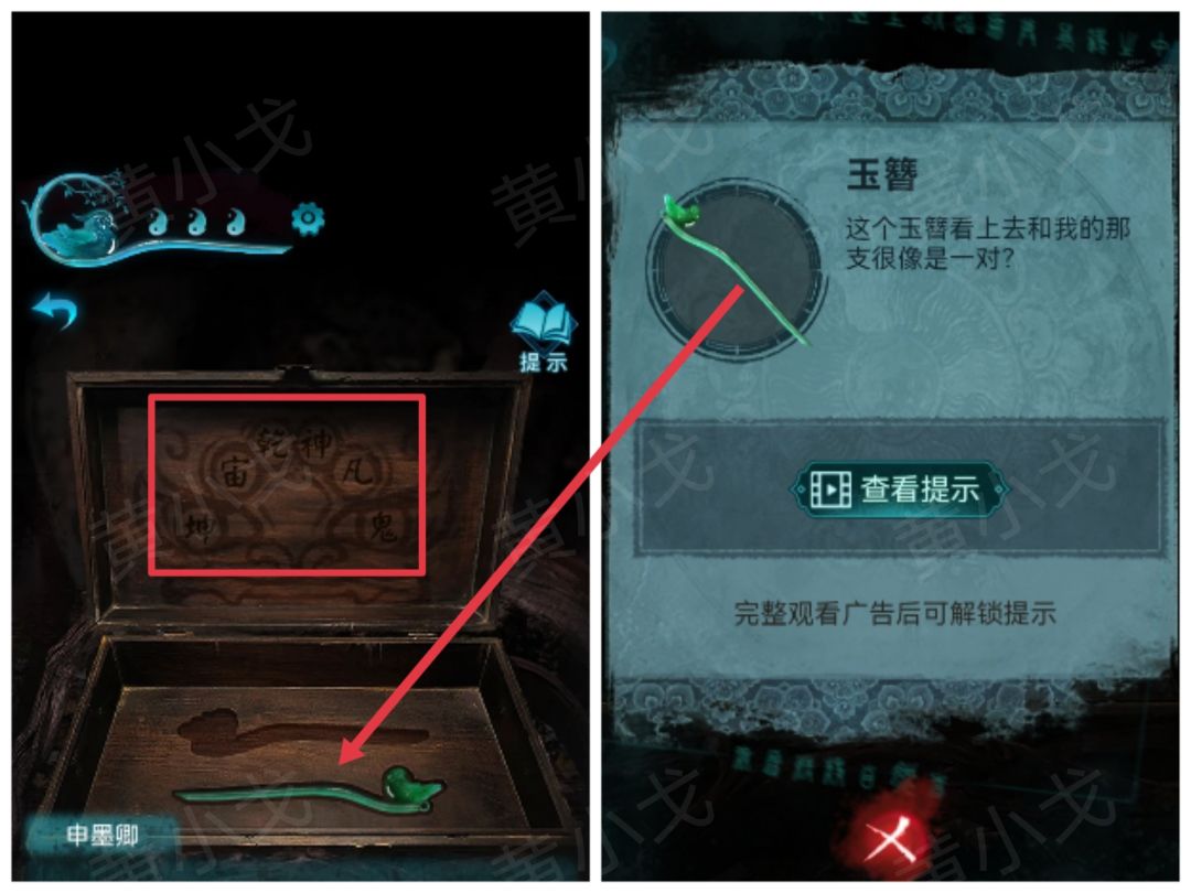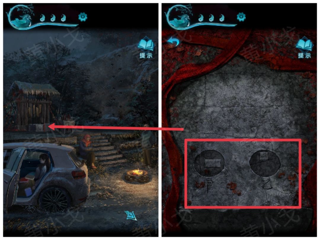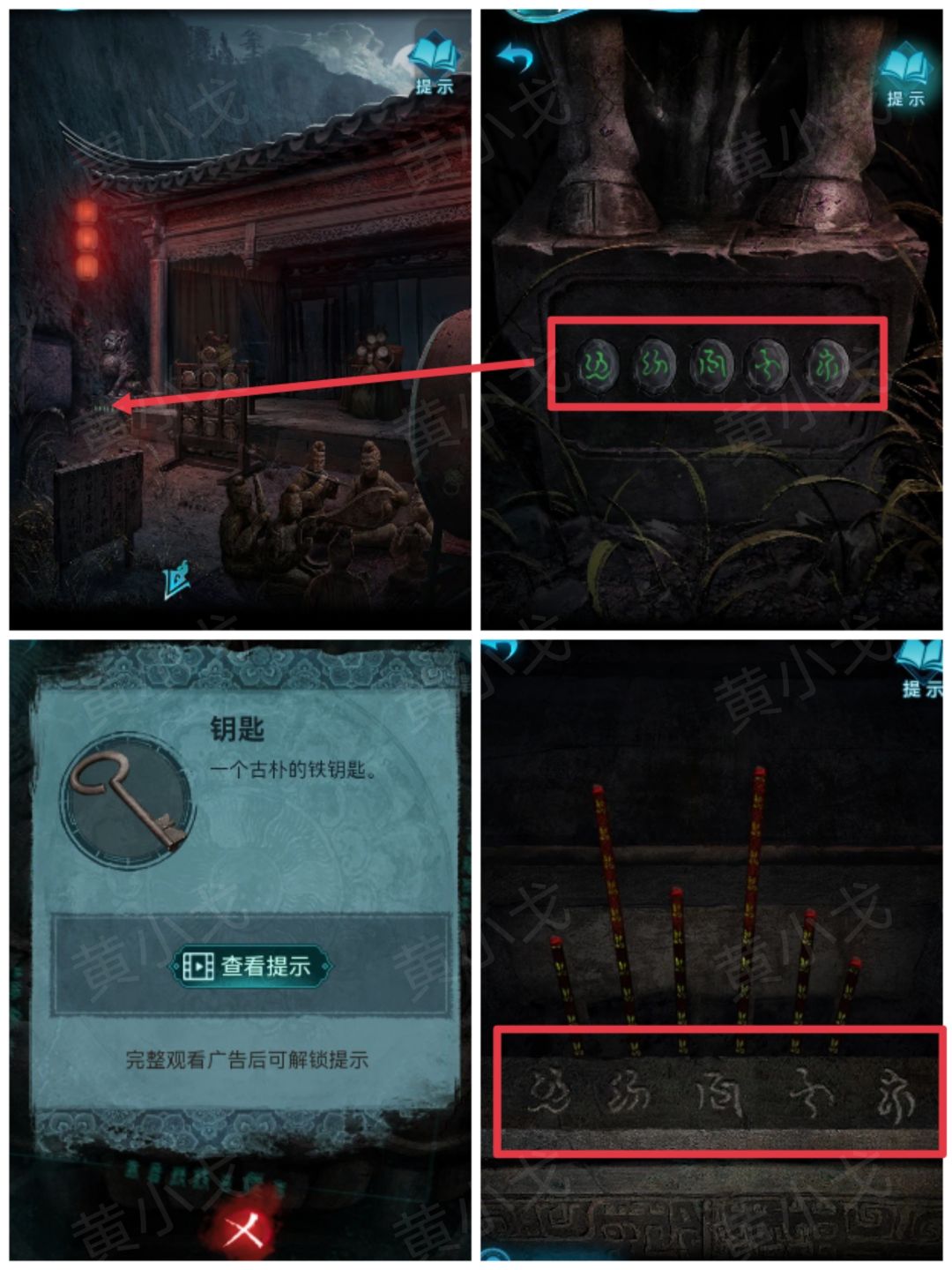 23.点击石像底座,根据燃香后得到的线索,调整正确的符号,获得【钥匙】