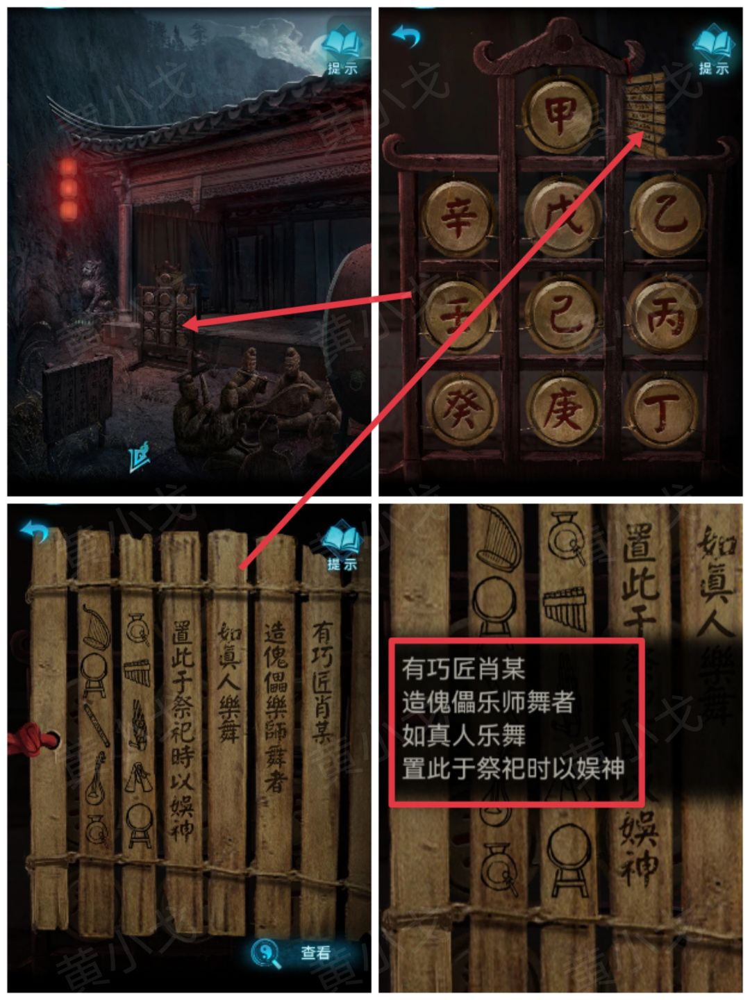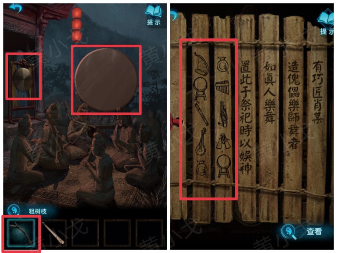 10.根据竹简上的线索,抓好时机,用【粗树枝】锣和鼓,戏台出现木偶
