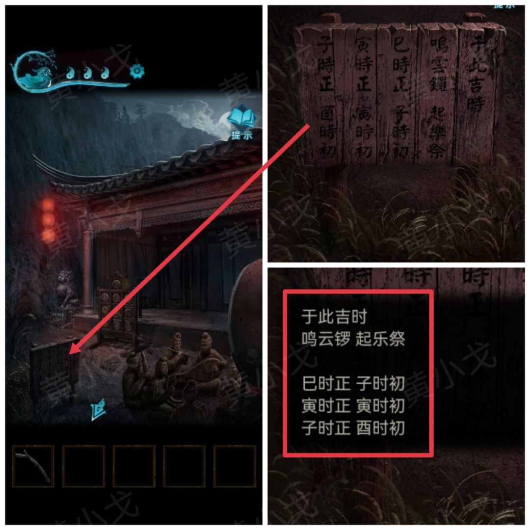 8.根据日晷上的时辰,结合归魂醮竹简上的线索和公告牌上的线索,用【粗树枝】按顺序敲钟