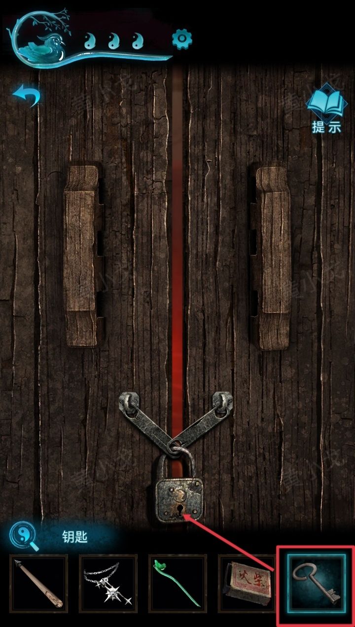 21.点击木门,按顺序拉开门栓,打开门缝;通过门缝往里看,获得线索