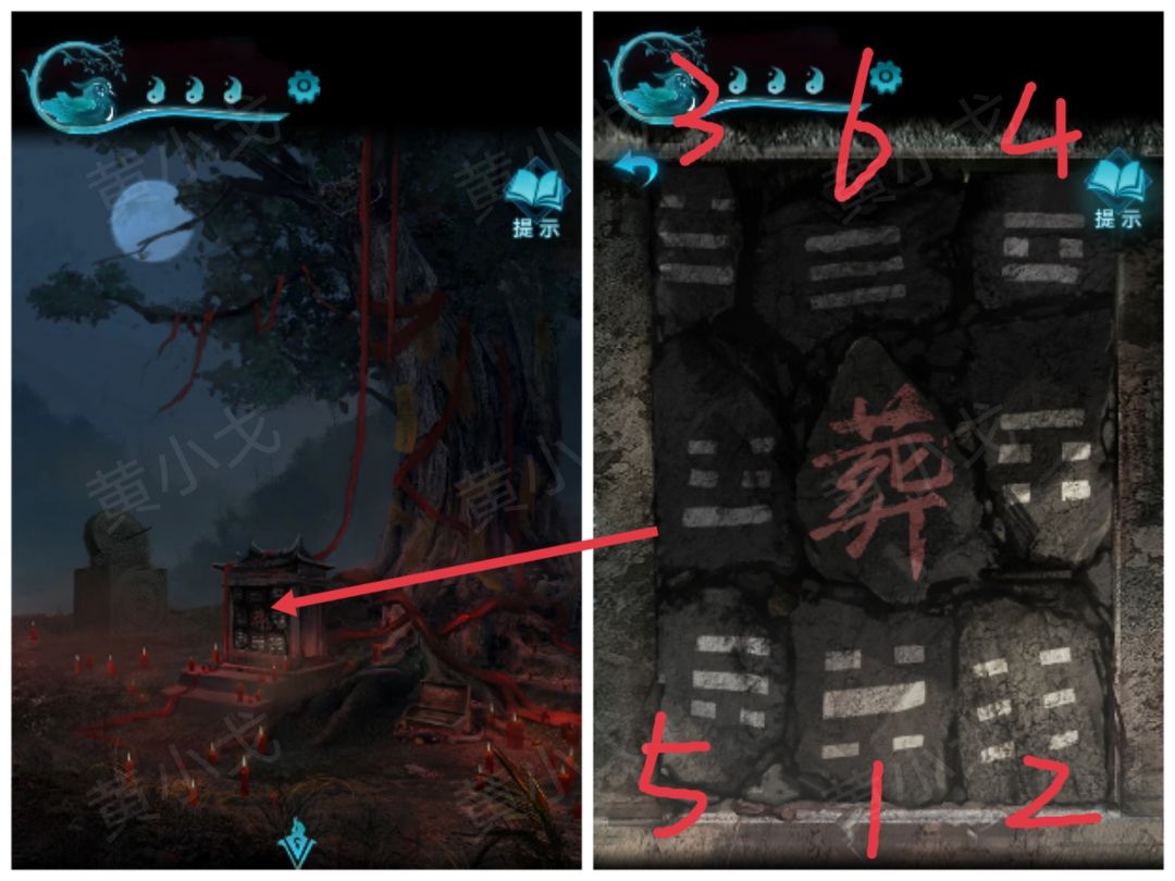 22.点击神龛里的机关,根据【纸条】线索,按正确的顺序排列石块