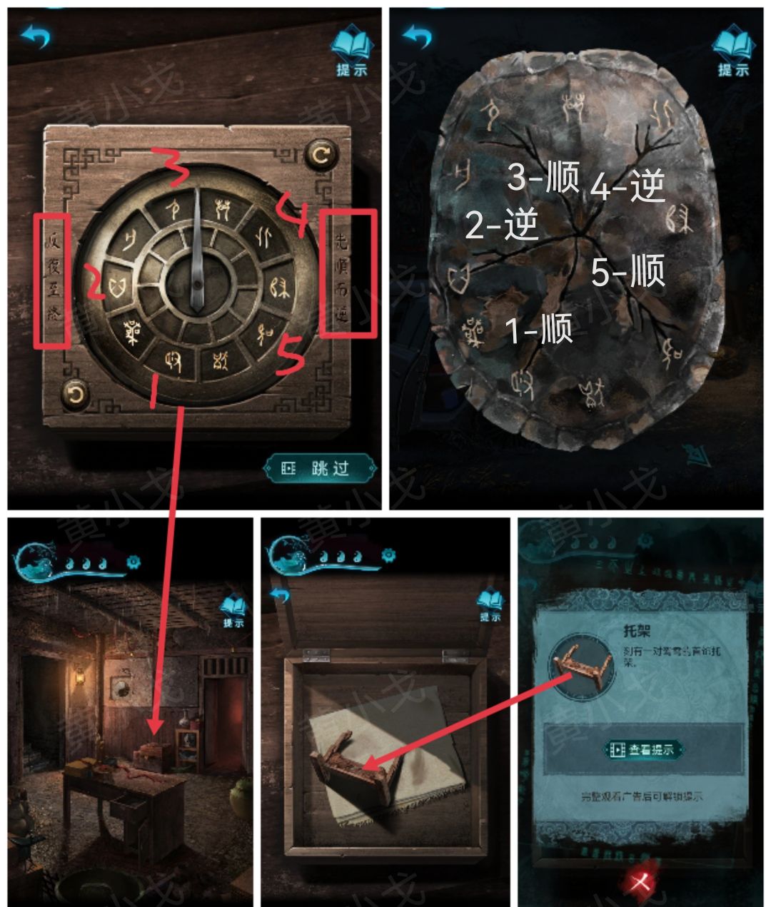 18.根据龟壳和箱子上的信息(先顺而逆)转动箱子上的机关,获得【托架】