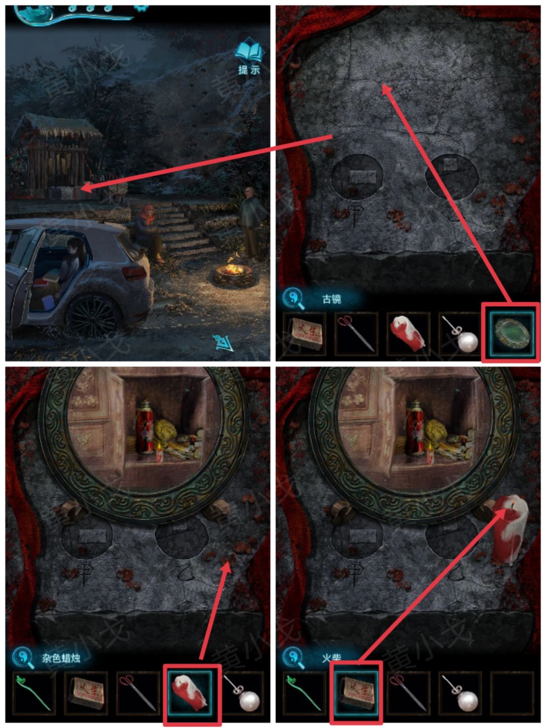 9.点击石台,放上【古镜】和【杂色蜡烛】,用【火柴】点燃蜡烛,获得线索