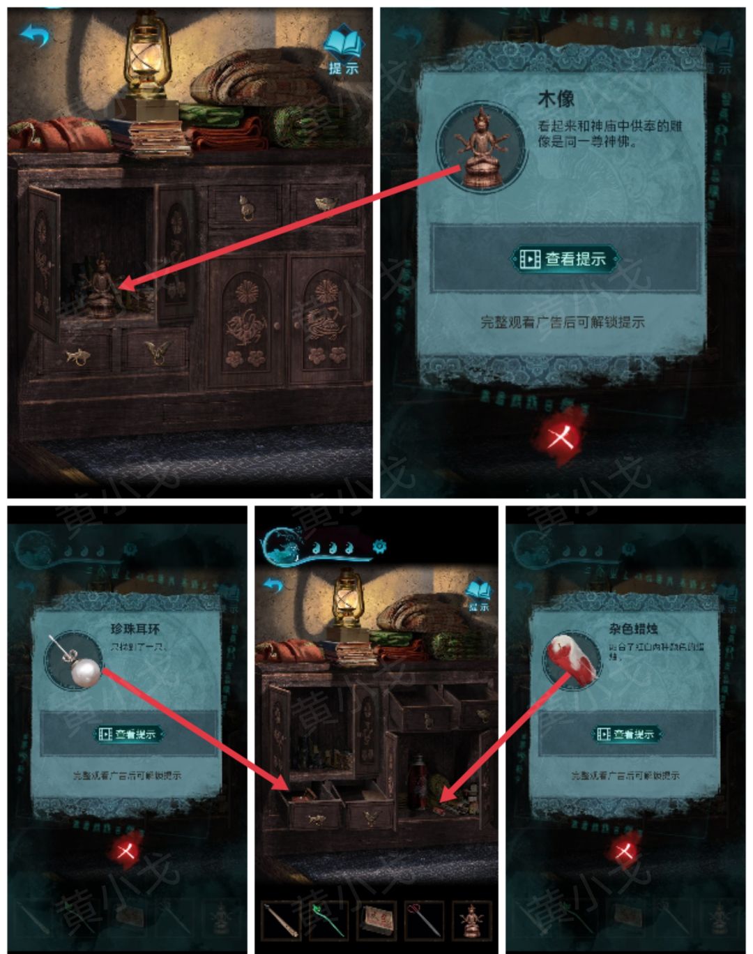 2.打开柜子,获得【木像】、【杂色蜡烛】和【珍珠耳环】