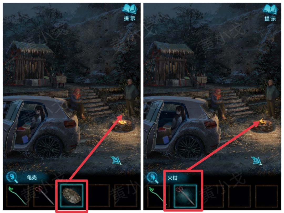 17.把【龟壳】放入火盆,用【火钳】夹取盆里的【龟壳】