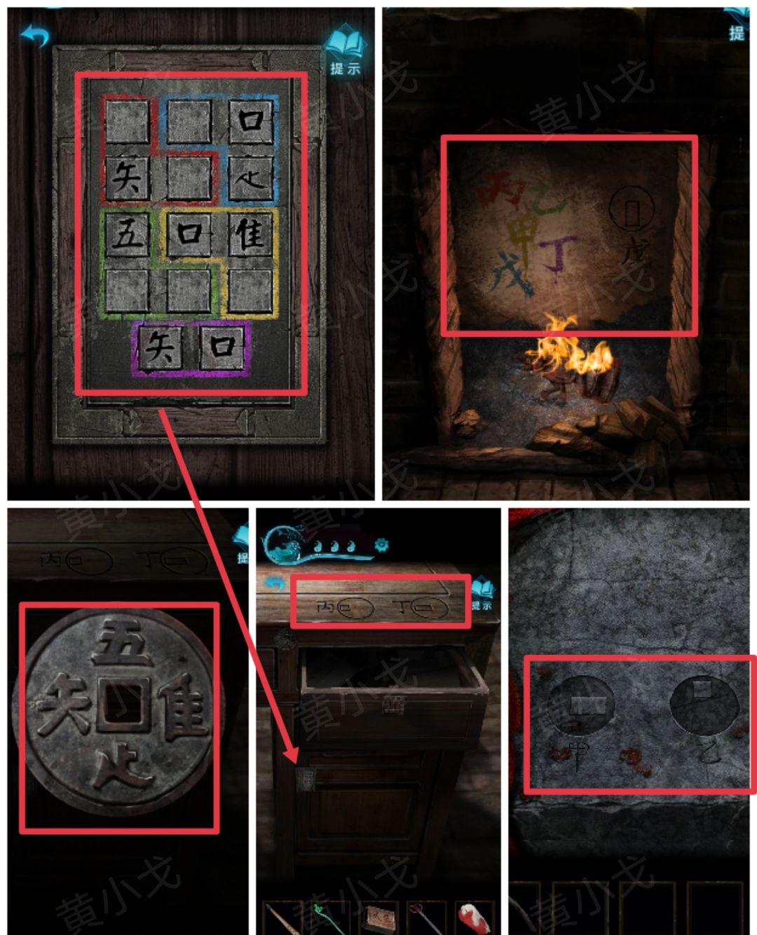 🔷解谜思路:壁炉上的颜色对应机关上的颜色,壁炉上的文字对应几个场景中的文字,图形对应古钱上字的位置(长一点的表示带上古钱中央的口字)