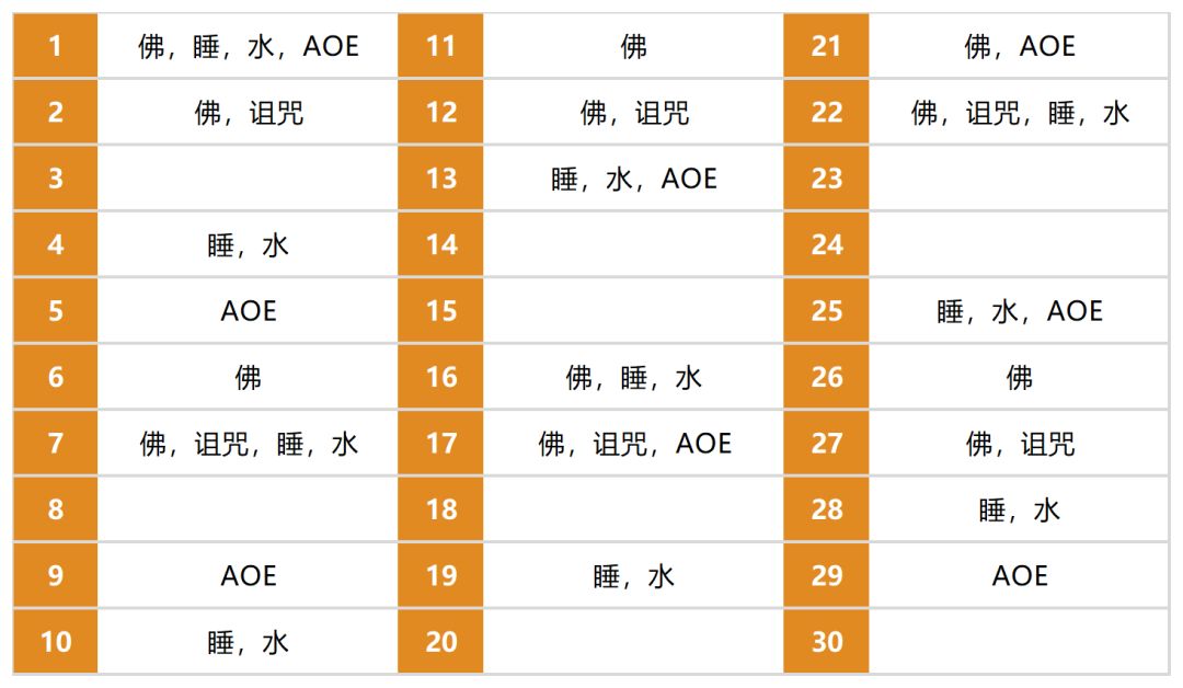 3️⃣ 第二关敌方技能:●周期性 AOE魔法(4n+1回合释放,n≥0)●睡眠/硬化精灵·强交替出现●偶数回合释放狂化,必须控住后排