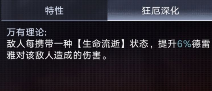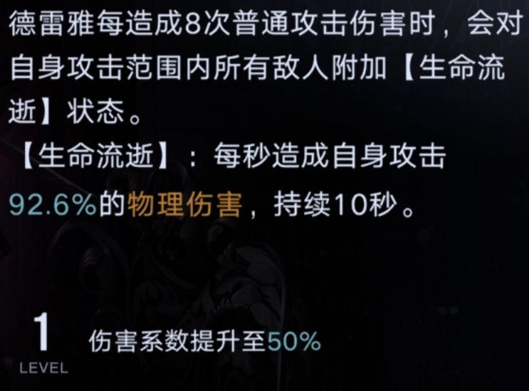 “生命流逝”效果是每秒造成一次伤害,而提升德雷雅被动二可以缩短这个时间间隔,即1-0.2=0.8秒触发一次。