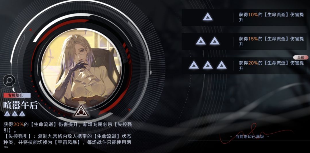 因为“生命流逝”伤害提升目前比较容易被稀释(茉莉被动一、烙印“黯星”都是这个乘区),所以没有必要三专,开专主要是获得可以使用两次的主动效果。