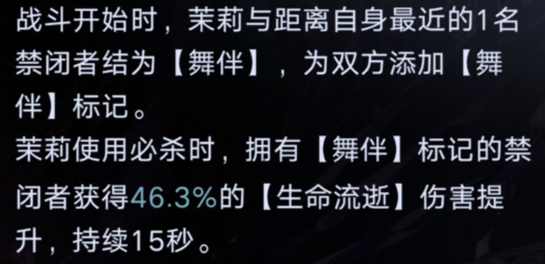 例如,在茉莉被动一生效前,移走距离茉莉最近的友方角色,那么标记会重新计算距离茉莉最近的友方角色并给予增益