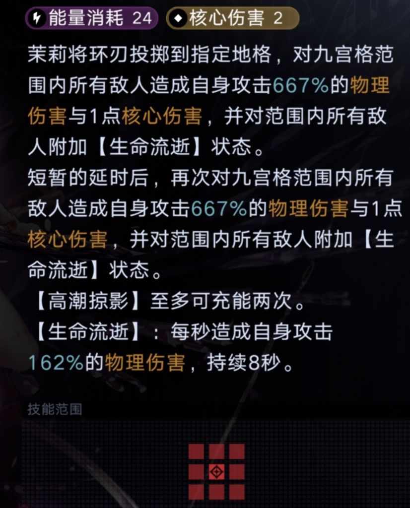 选定九宫格范围造成伤害并破一核附加流血;约1.5秒后再次造成伤害并破一核附加流血