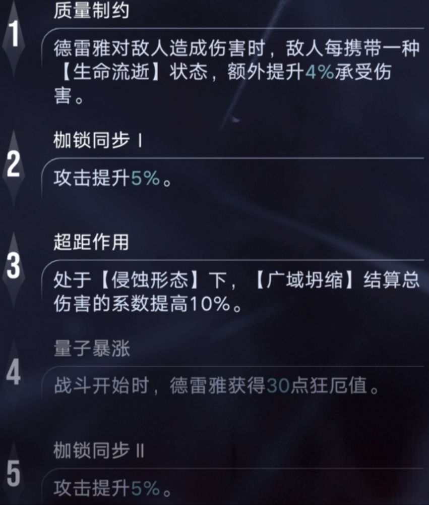 流血队输出角色同款,很容易理解的效果,目前敌方5层“流血”可以提升德雷雅对目标30%的伤害