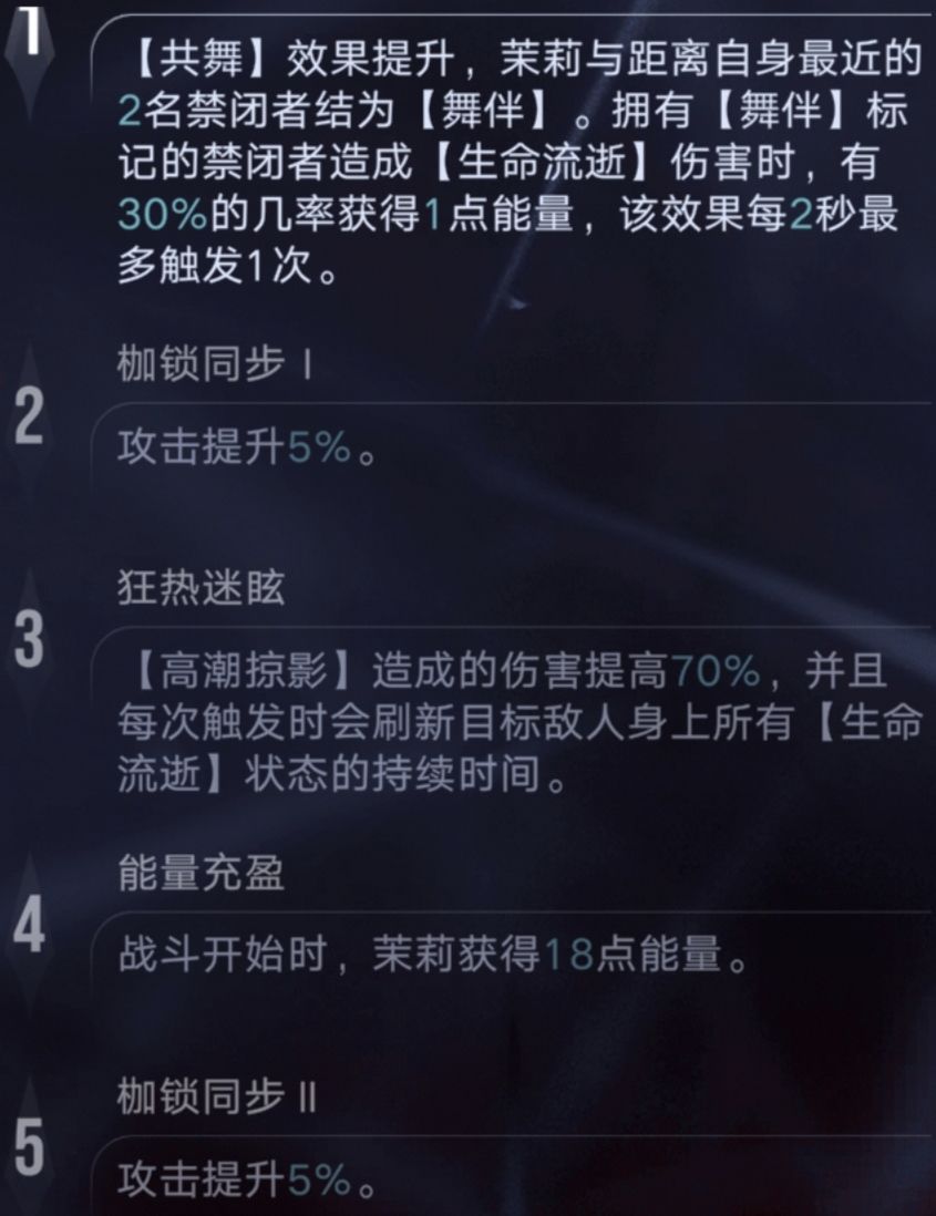 0锁茉莉已是完全体;1锁提升巨大,多一名【舞伴】并且加快角色技能回转;其它枷锁没有特别关键