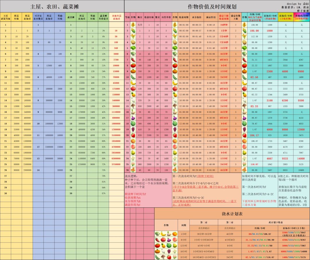 ①不同的作物成熟时间给了玩家不同的选择,前期缺经验值后期缺金币。最初期优先考虑种玉米和生菜,中后期可根据大佬们分享的作物清单挑选升级经验还是增加金币(附表)