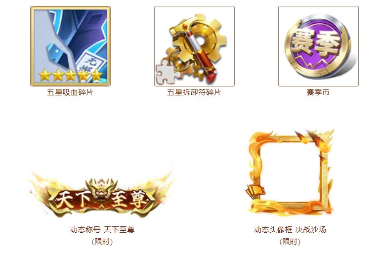 赛季奖励:决战沙场(限时60天)头像框、天下至尊(限时60天)称号、文姜·相思竟夕(永久)皮肤、五星吸血碎片、五星拆卸符碎片、赛季币等奖励等你来拿!