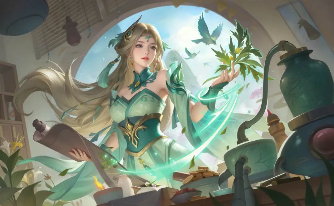 慕容新皮肤则是以药王山悬壶隐士为灵感,融合草木文化,展现一位药师形象。蒸馏取露间,是她对草木的敬畏与对生命的关怀。手中长卷是她隐居山谷时潜心研习的药方,见证着她悬壶济世的坚守。