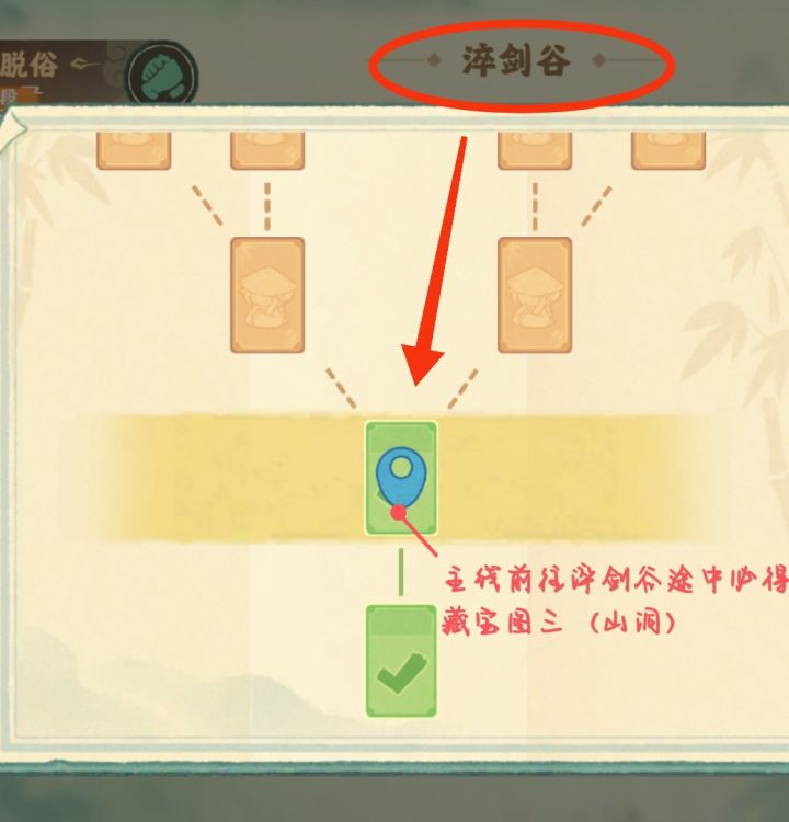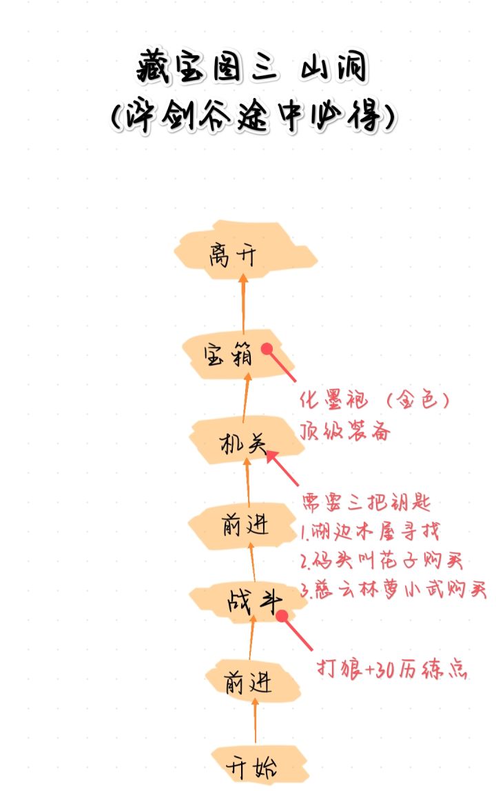 3.主线剧情慈云林之后前往淬剑谷途中必得藏宝图三,山洞里直线无分支,但有机关需要三把钥匙,集齐再去方便点