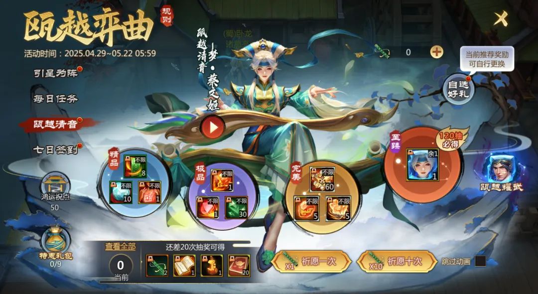 累计抽奖达120抽必得至臻大奖,至臻大奖中可得梦*蔡文姬全新封灵玉【瓯越清音】——净化所有负面状态,四重法伤瞬发,攻防局势变化只一瞬,这个加成我爱了!