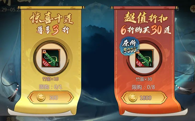 限购1次的3折特价竹笛*10连,限购8次的6折特价竹笛*30连礼包,助你早日抽中至臻大奖!