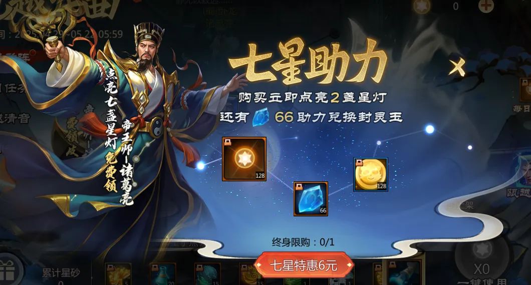 超值精品6元礼包直送星子*128、封灵玉碎片*66、绑定梦币*128,可直接点亮两盏星灯,助你早日拿到诸葛亮*帝王师新换装!!