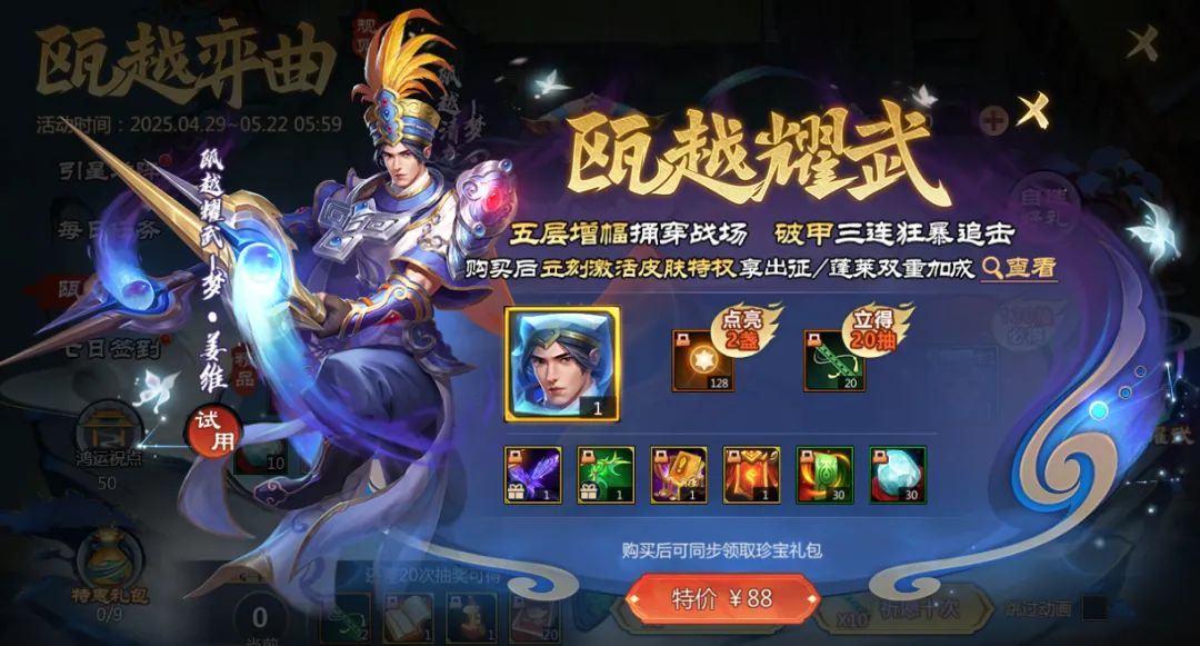 五层增幅捅穿战场。破甲三连狂暴追击,梦*姜维全新换装——瓯越耀武,特价88礼包限时上架!