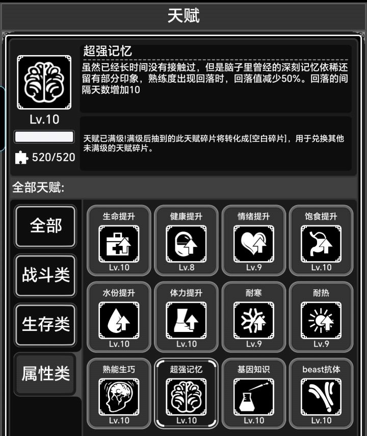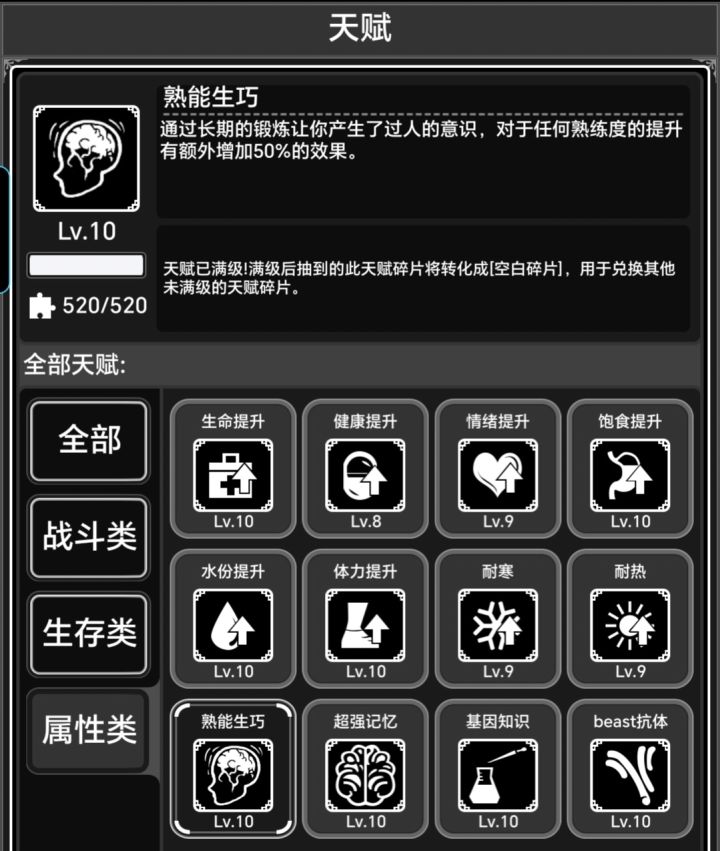 天赋:每级加5%熟练度获取,满天赋+50%。