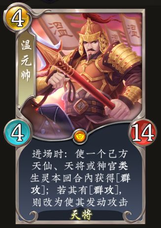 进场时:使一个己方天仙、天将或神官类生灵本回合内获得[群攻];若其有[群攻],则改为使其发动攻击