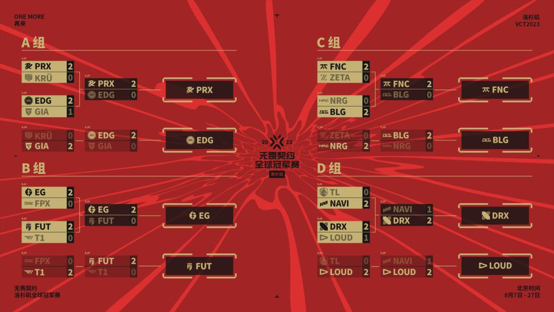 北京时间 8 月 14 日,经过 8 个比赛日的厮杀,2023无畏契约洛杉矶全球冠军赛的小组赛阶段比赛已全部结束,来自 CN 赛区的 EDG、BLG 两支战队表现出色顺利杀入八强,他们接下来将在双败淘汰赛阶段与来自太平洋赛区的 PRX、DRX,来自美洲赛区的 EG、LOUD 以及来自 EMEA 赛区的 FNC、FUT 角逐今年的全球冠军赛总冠军!