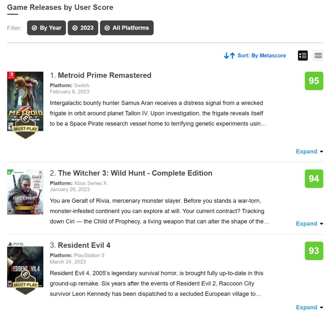 撰写这篇评测之前,我打开评分网站 MetaCritic,点击「Best Games This Year」,除去登陆了多平台的同款游戏,排名前十的分别是《密特罗德 究极 复刻版》《巫师 3 狂猎 完全版》《生化危机 4 重制版》《俄罗斯方块效应 连接》《女神异闻录 4 黄金版》《死亡空间 重制版》《Hi-Fi Rush》《霍格沃茨的传承》《死亡细胞 重返恶魔城》《Rez 无限》。
