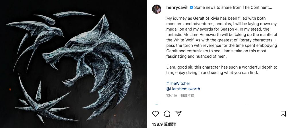 亚姆·海姆斯沃斯随后在社交平台回应了亨利·卡维尔的发声,并称自己非常高兴有机会饰演杰洛特一角,「亨利,我一直是你的粉丝,你饰演的杰洛特对我有非常深的启发,或许我还要付出不少努力才能填补你的空缺,但我真的为加入这部剧感到非常兴奋。」