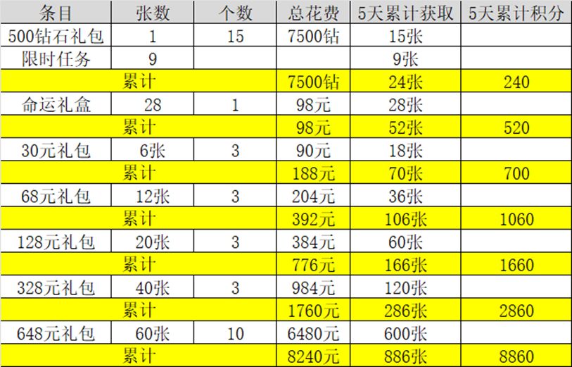 小氪可以考虑买完所有30礼包和命运礼盒,一共花费248,加上完成所有任务和购买所有钻石礼包,刚好可以完成两轮。也可以囤三期,一共700多便能完成4轮活动。
