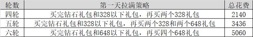 如果买完所有68以下礼包,囤两期只需1200也可以完成四轮活动。囤三期的话,再补个128即可2000左右完成六轮活动。