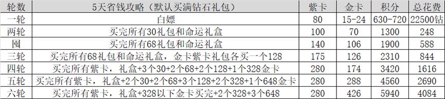 最后我们总结一下各轮数下最有性价比的方法。注意,这里的策略是按照最后一天再抽来算的,且氪金情况下默认完成三个觉醒任务。囤的那行策略是:可以囤两期在1200以内拿四轮奖励,或者囤三期再补个128,用2000左右拿六轮奖励。