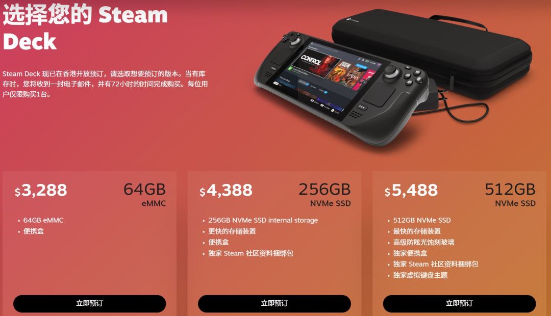 Steam Deck 的三个版本在上述地区的售价不尽相同,以大陆地区玩家比较容易通过转运手段获得的香港地区售价为例,价格分别为 3288 港币、4388 港币和 5488 港币(折合人民币分别为 2826 元、3772 元、4714 元 )。