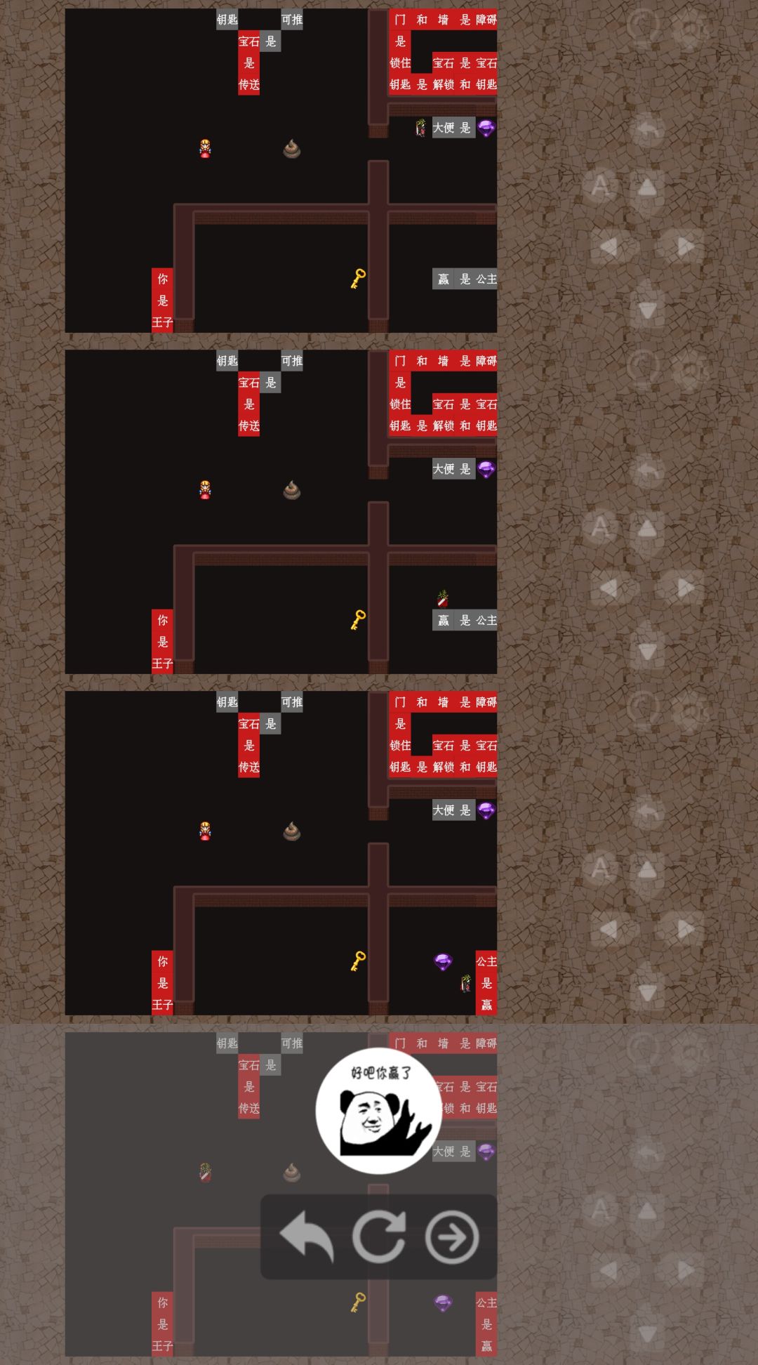 5、按图5-1所示,向右推“大便是赢”,把“赢”字传送过去并组成“公主是赢”。再传送出去,触碰【公主】即可过关。