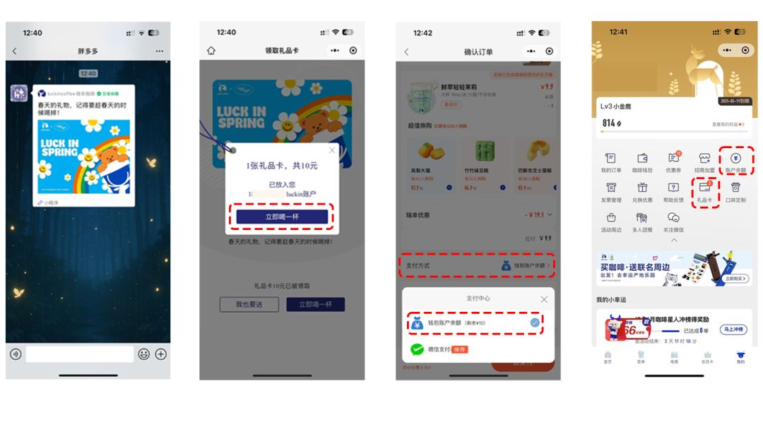 第四步:领奖!如果中了咖啡券,点击多多分享的链接,进入瑞幸咖啡小程序。按照提示一步一步操作,将支付方式修改为账户余额,余额金额正确说明领取成功。