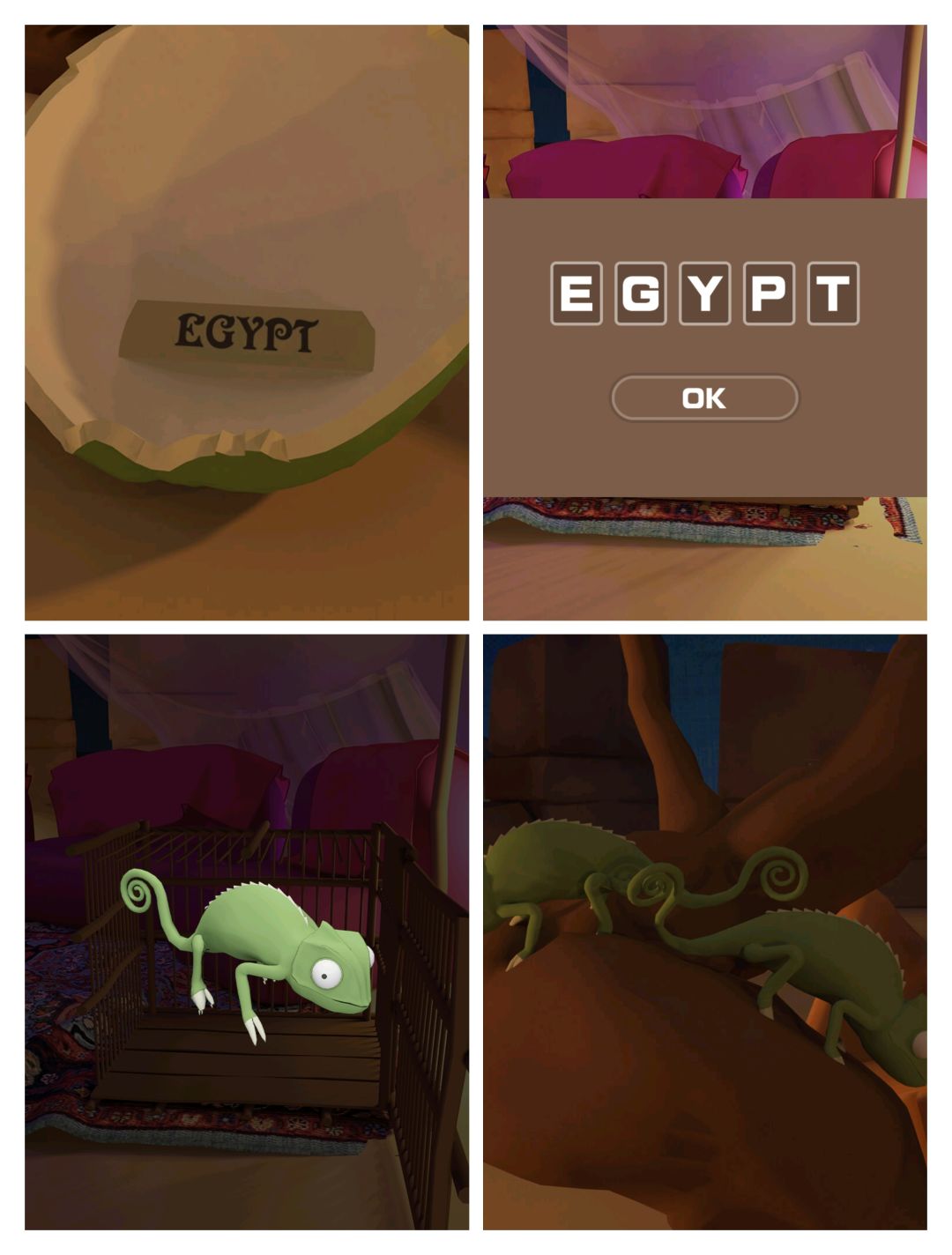 弹弓打下③熊猫头上的椰子 得字母提示 打开①蜥蜴笼子 得蜥蜴