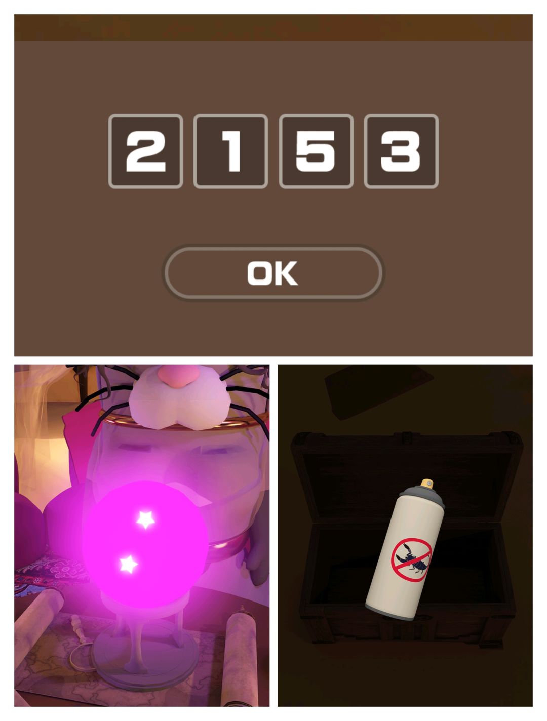 10.水晶球给①小猫 得数字提示(2153) 打开③箱子 得杀虫剂 驱赶⑤虫子 得刷子