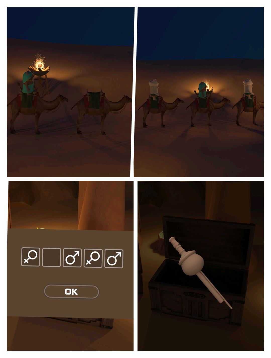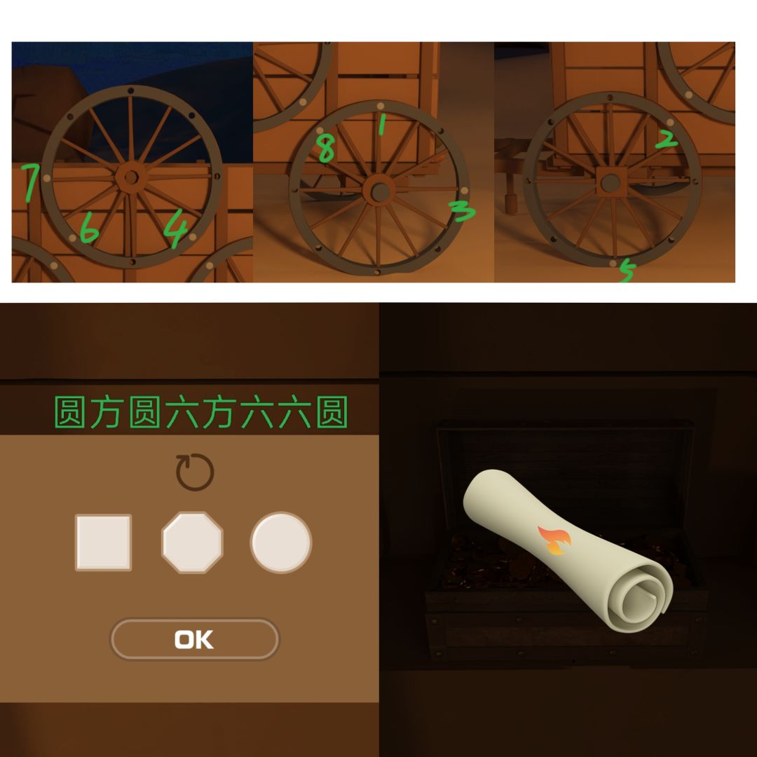 望远镜观察④左上方 看到骑骆驼的人 根据衣服判断出绿女白男 打开①右箱子 得乐器